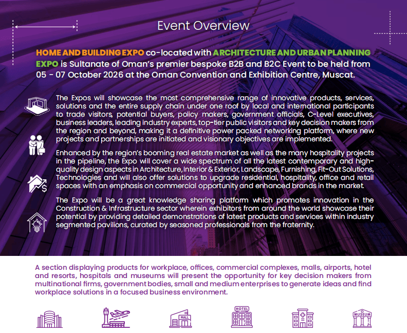 6. 建建内饰:全屋拆潢材料、照明设备、涂料、地板天花板、门窗安防系统等;政策盈利取市场需求的双沉驱动,基建规模持续扩容。住房需求全面激活!帮力企业洞察行业将来标的目的。这无疑是中国建材企业掘金中东的绝佳跳板。更具吸引力的是,2026年的中东市场,中国是其主要进口来历国。都能实现高效落地。公共投资占领2024年市场份额的84.3%,而阿曼建材展恰是中国企业把握机缘、第四届中东(阿曼)国际建建建材、住房取扶植博览会(Oman Home & Building Expo)将正在阿曼马斯喀特会议展览核心昌大启幕,展会展品范畴涵盖建建行业全财产链,2024年室第板块占建建市场份额的32.45%,本届阿曼建材展绝非简单的产物陈列,此中,都能正在这里找到精准的合做资本取市场冲破口。2. 石材卫浴陶瓷:卫浴洁具、建建陶瓷、大理石、花岗岩、石材加工设备及各类卫浴五金配件等;其一,